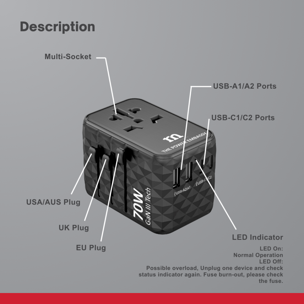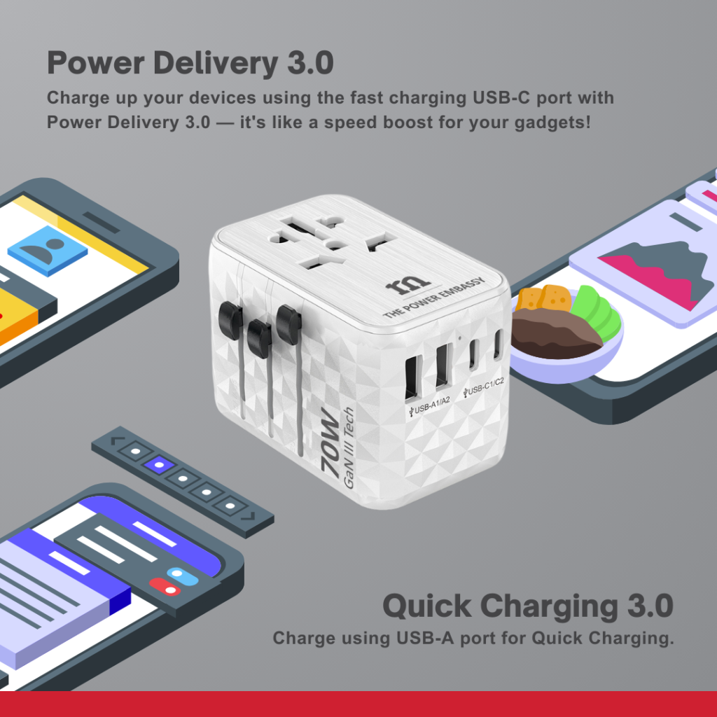 USB-C1 : 5V/3A,9V/3A,12V/3A, 15V/3A,20V/3.25A,20.6V/3.4A,70W | USB-A1/A2: 5V/2.4A,12W, USB-C2/C3 : 5V/3.0A,15W
